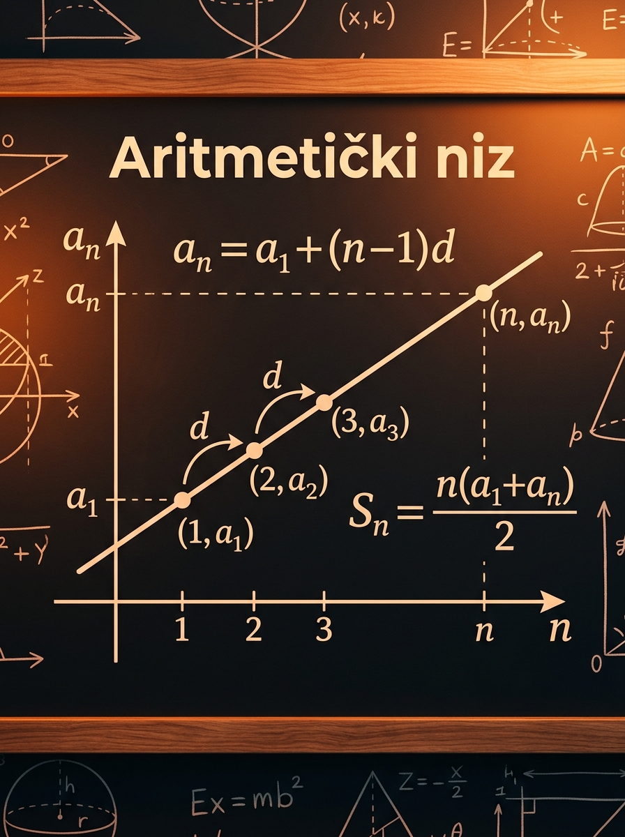 Aritmetički niz je jedna od prvih tema u kojoj isti obrazac vidiš kroz više lica: kao listu brojeva, kao formulu za član, kao zbir i kao linearnu zavisnost od indeksa. Na prijemnom se baš zato često koristi kao test razumevanja.