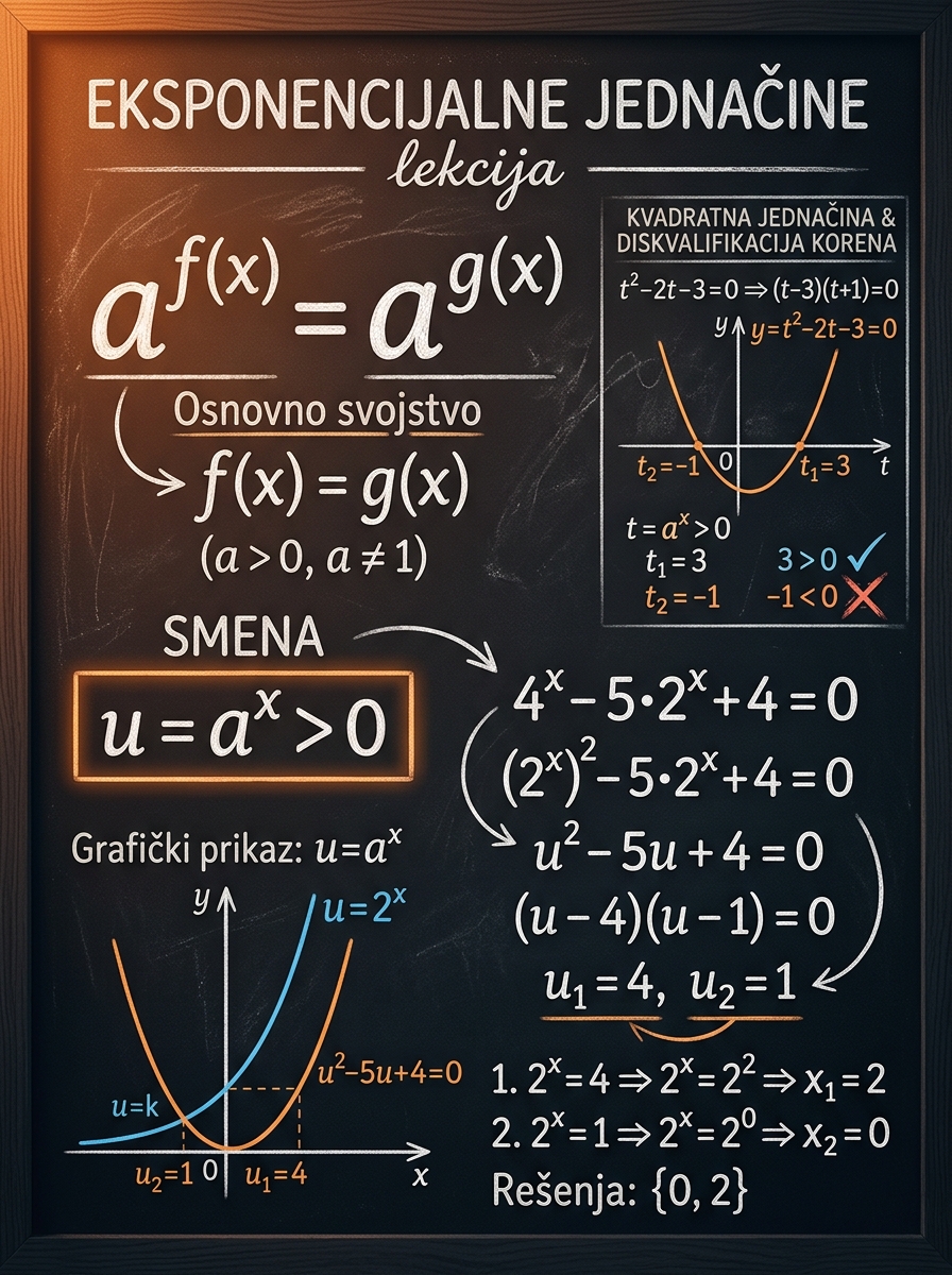 Kod smene \(u=a^x\) negativan koren kvadratne jednačine automatski otpada. To je obavezna provera, ne opcija.