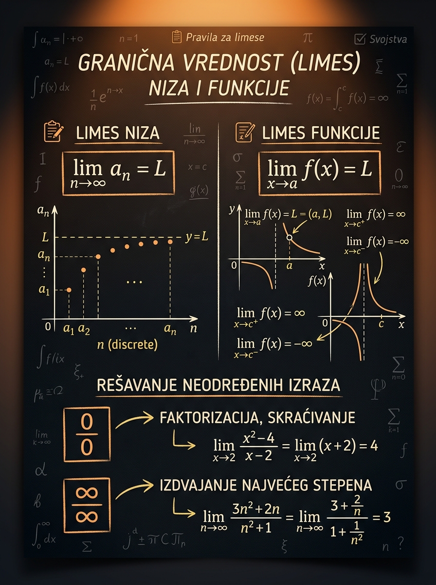 Limes je prvi veliki korak iz školske algebre ka matematičkoj analizi. U ovoj lekciji nećeš samo računati rezultate, nego ćeš naučiti šta zaista znači da se niz ili funkcija približava nekom broju, kako da prepoznaš neodređenost i kako da iz limesa pročitaš asimptotu bez haotičnog računanja.