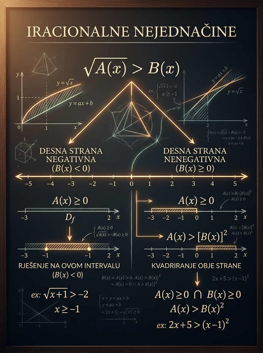 Iracionalne nejednačine deluju kratko, ali su suštinski logički zadaci. Ispitivač ne proverava samo da li umeš da kvadriraš, već da li razumeš da je √A(x) uvek nenegativno i da zbog toga znak izraza B(x) menja čitav tok rešenja.