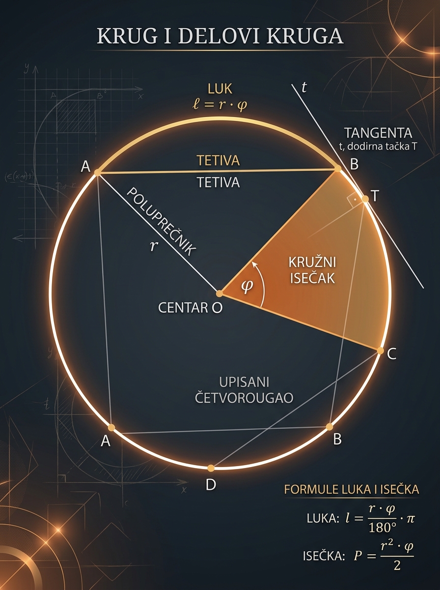 Ova lekcija spaja dve stvari koje učenici često uče odvojeno, a na prijemnom se pojavljuju zajedno: računanje obima, površine, luka i kružnog isečka, kao i prepoznavanje osobina tetivnih i tangentnih četvorouglova. Kada razumeš da je centralni ugao glavna „komanda“ koja upravlja lukom, tetivom i isečkom, formule prestaju da budu nešto za bubanje i postaju logične.