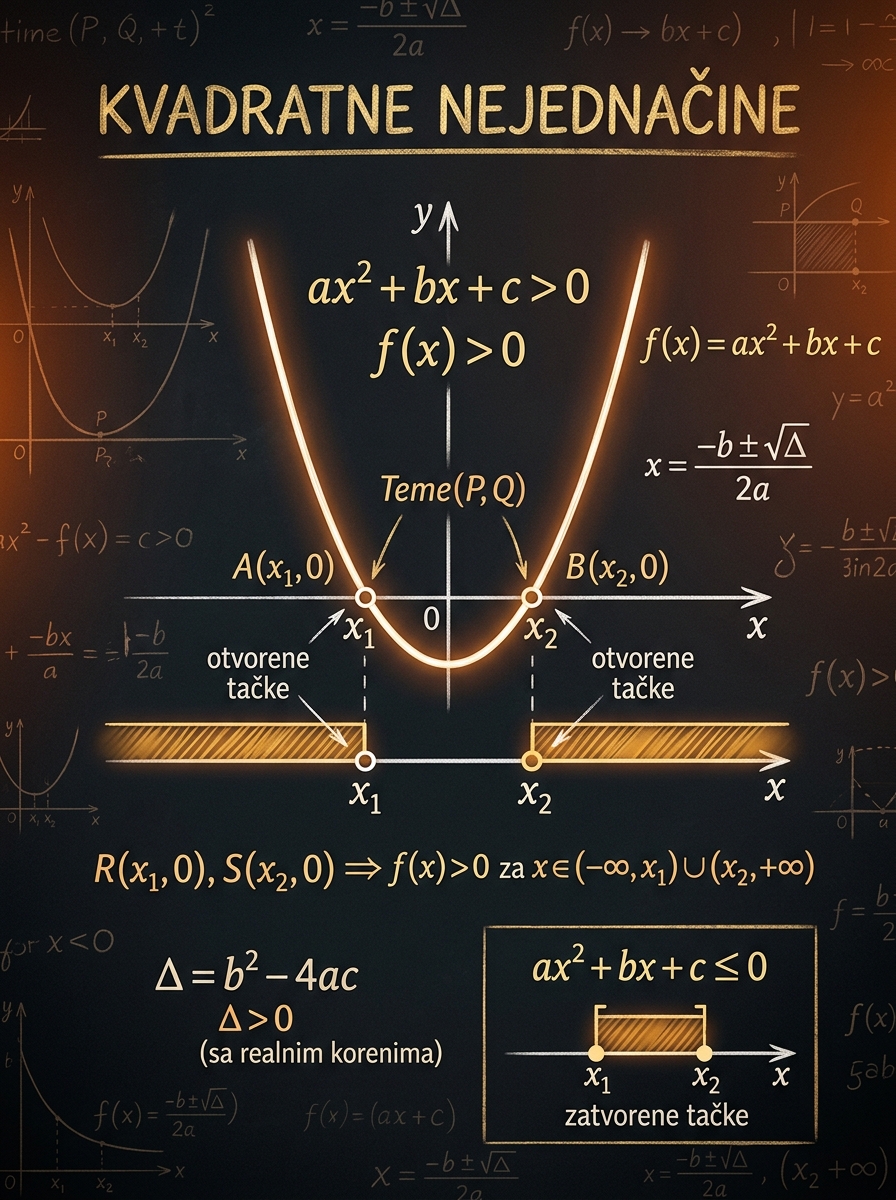Kada na prijemnom vidiš kvadratnu nejednačinu, cilj nije da mehanički nađeš korene pa nešto napišeš oko njih. Cilj je da iz dve informacije, znaka koeficijenta a i položaja nula, odmah pročitaš gde je parabola iznad, a gde ispod x-ose. Tada rešenje postaje logično, a ne napamet naučen šablon.