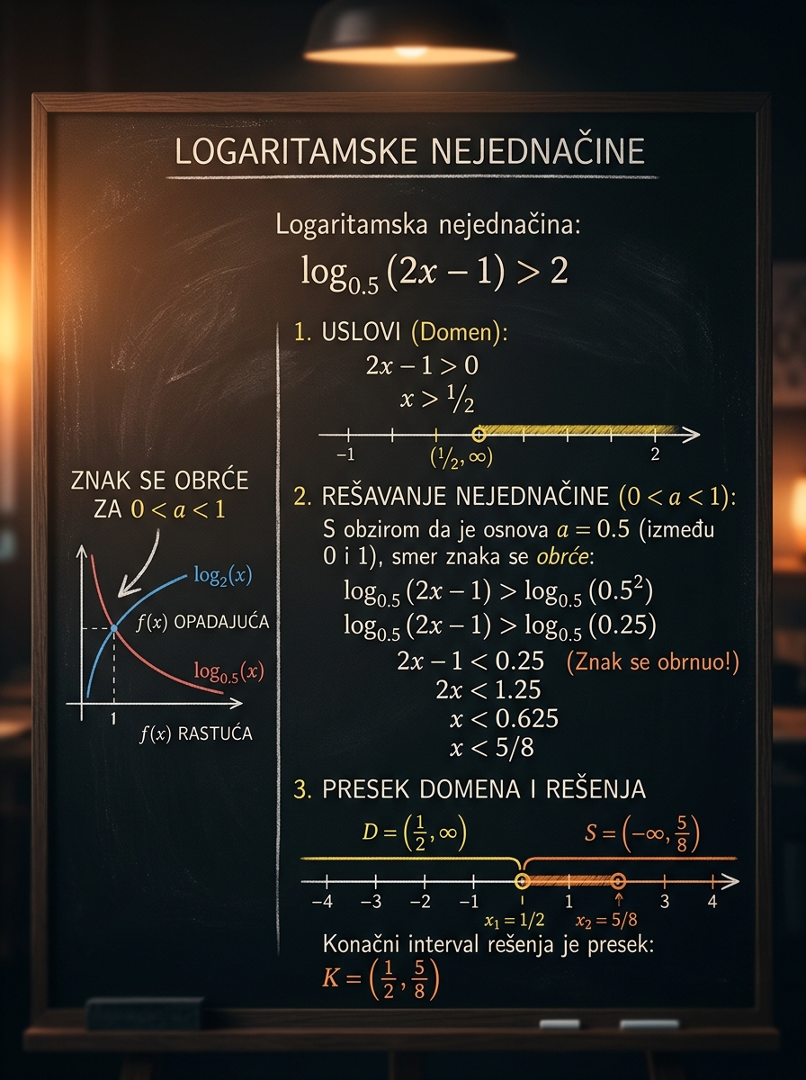 Ovo je deo gradiva u kome se najlakše izgubi smer razmišljanja. Nije dovoljno samo rešiti dobijenu nejednačinu: moraš da proveriš domen, da znaš da li se znak čuva ili obrće i da tek onda presečeš dobijeni skup sa uslovima definisanosti.