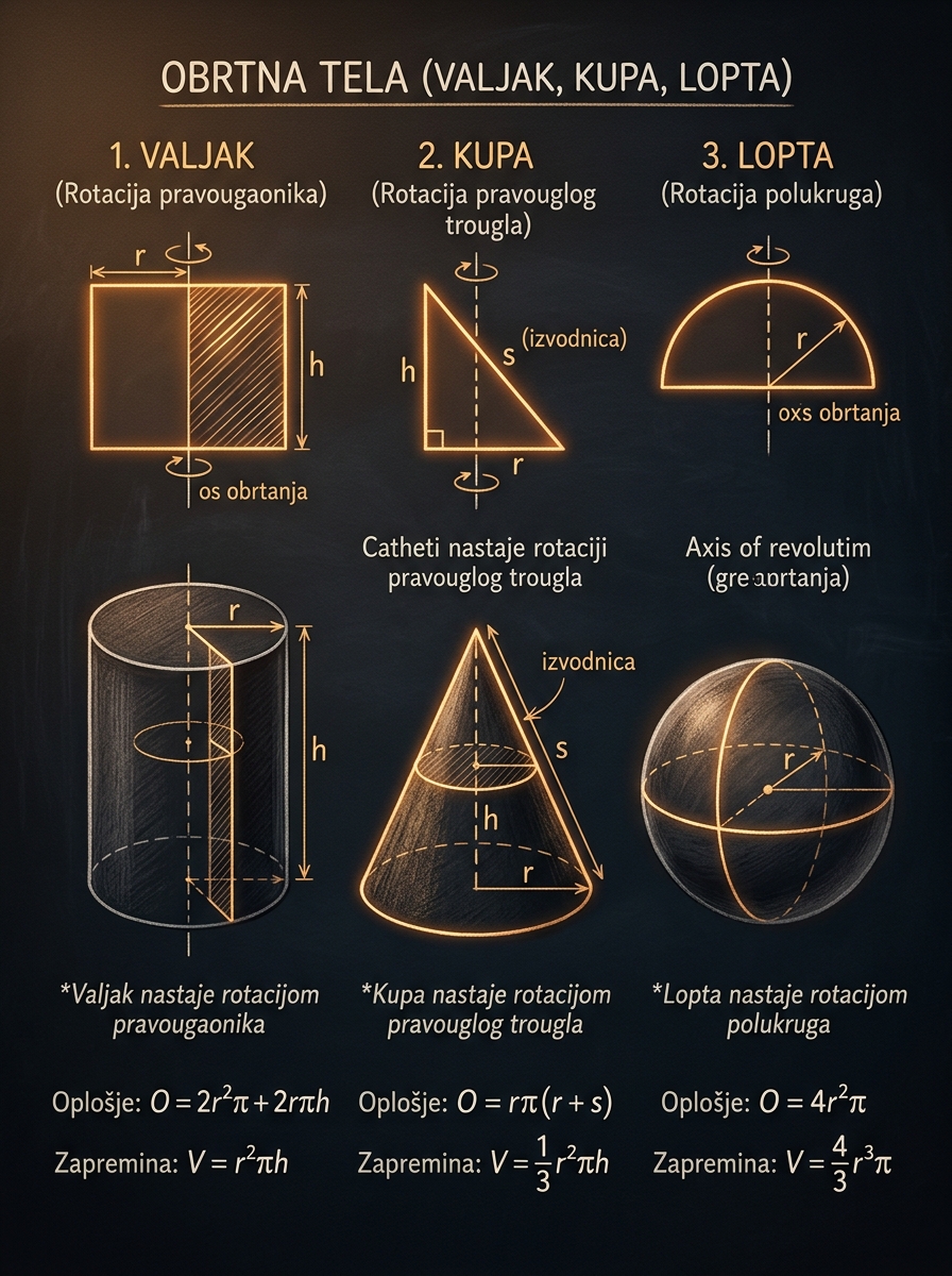 Obrtno telo nastaje kada ravnu figuru obrneš oko neke prave. Ta prava je osa obrtanja. Da bi učenik lakše pamtio formule, korisno je da uvek krene od pitanja: koja ravna figura se rotira i koji njen segment postaje r, h ili s?