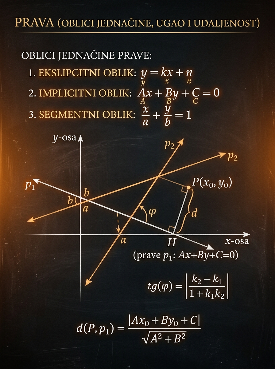 Prava nije samo jedna formula. Ona je objekat koji posmatraš iz različitih uglova. Eksplicitni oblik ti daje nagib, implicitni oblik ti daje opštost i rastojanje, a segmentni oblik ti daje preseke sa osama. Kada znaš da izabereš pravi zapis, skoro svi zadaci iz ove oblasti postaju kratki.