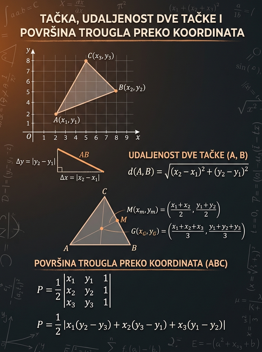 Od položaja do formule: kako da iz koordinata pročitaš rastojanje, sredinu duži, tačku podele, težište i površinu trougla.