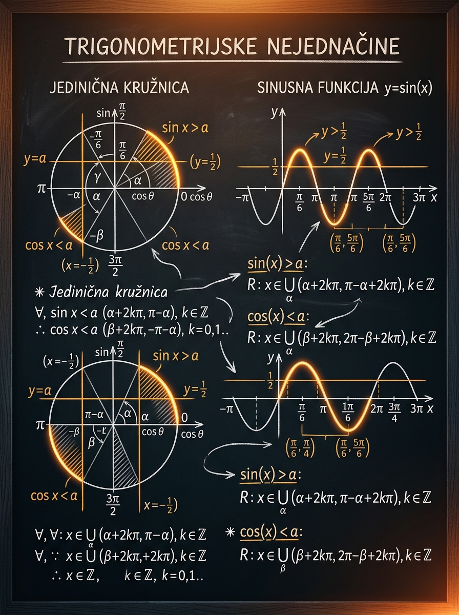 Trigonometrijske nejednačine su važan korak jer te teraju da trigonometriju ne vidiš samo kao račun, nego kao geometrijsku sliku i znak funkcije. Na prijemnom to znači da više ne dobijaš poene za puko pamćenje formule, već za to da razumeš gde je funkcija pozitivna, veća od neke granice ili između dve vrednosti.