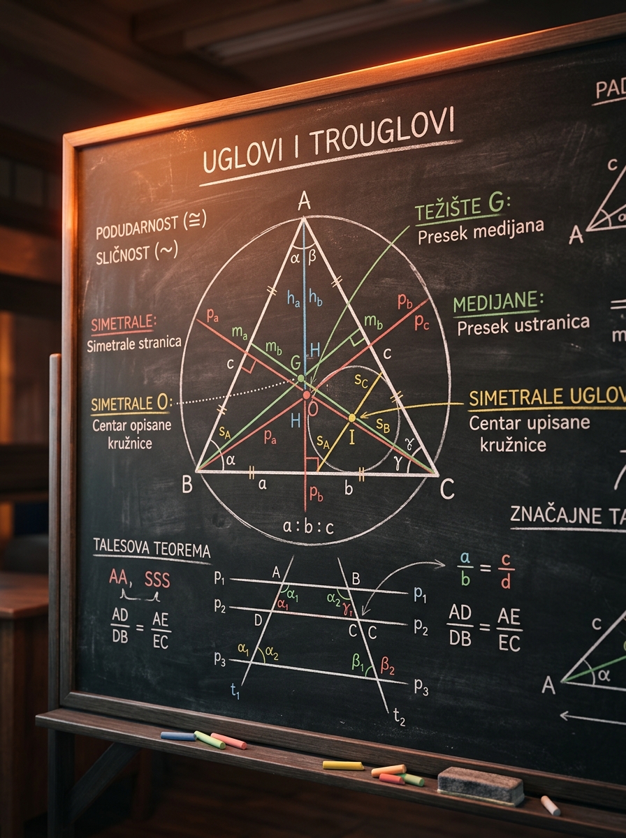 Ovo je lekcija u kojoj geometrija prestaje da bude skup nepovezanih formula. Kada razumeš kako se iz uglova prelazi na podudarnost, iz paralelnosti na sličnost, a iz konstrukcije na značajne tačke trougla, dobijaš alat koji rešava veliki broj planimetrijskih zadataka na prijemnom ispitu.