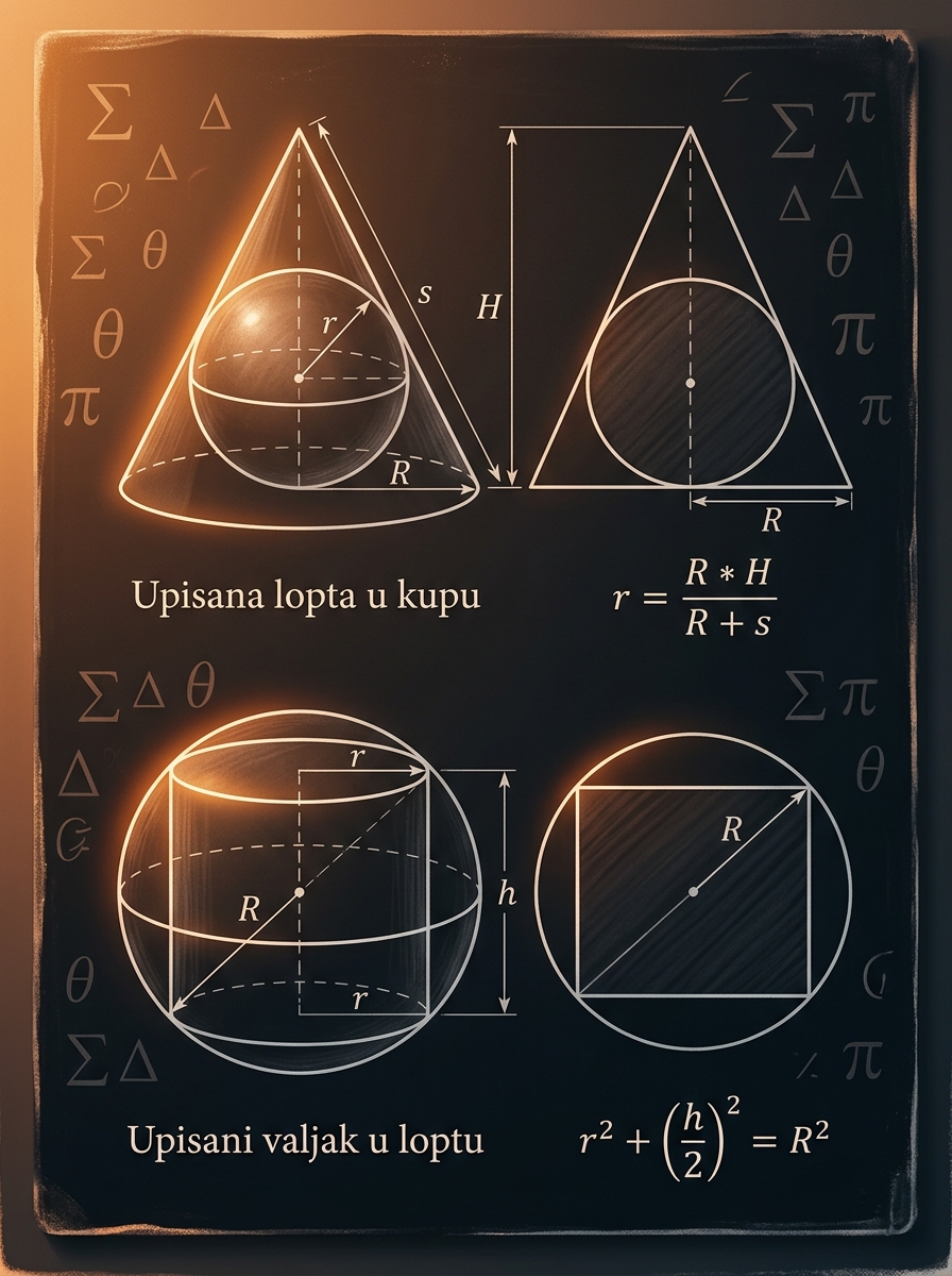 Na prijemnom se ova tema često javlja kao završni nivo stereometrije. Zadatak izgleda komplikovano jer u istom trenutku vidiš dva tela, više različitih mera i uslov dodira. Ali kada nađeš pravi presek, problem postaje mnogo mirniji: umesto „lopte u kupi“ zapravo rešavaš „krug upisan u jednakokraki trougao“, a umesto „valjka u lopti“ rešavaš „pravougaonik upisan u krug“.