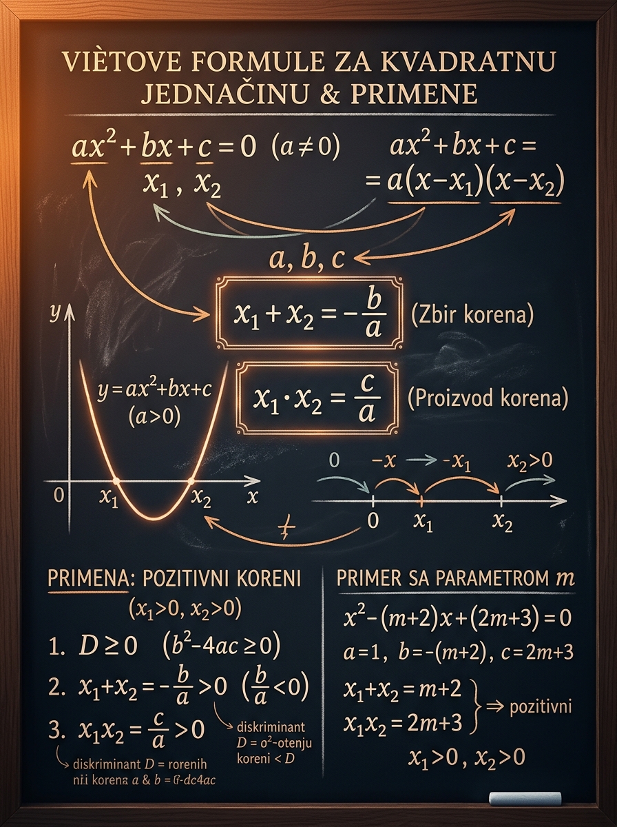 Nemoj Viètove formule učiti kao dve izolovane formule. Uči ih kao ideju: iz faktorizacije dobijaš vezu između korenova i koeficijenata. Kad to razumeš, sve primene postaju prirodne.